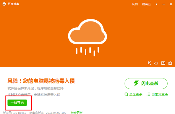 百度杀毒出现“风险!您的电脑易被病毒入侵”提示,可能是由于未开启百度杀毒“实时监控”或“自保护”功能引起的。请在主界面右上角点击倒三角下拉菜单,进入设置中心,检查是否开启实时防护和软件自保护,也可以从主界面直接操作“一键开启”。