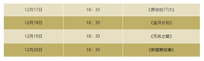 「山顶放映」特别联合了英皇电影,精选四部不同风格的影片《原谅他77次》《宝贝计划》《无名之辈》《新警察故事》,于每日18:30准时开始放映。
